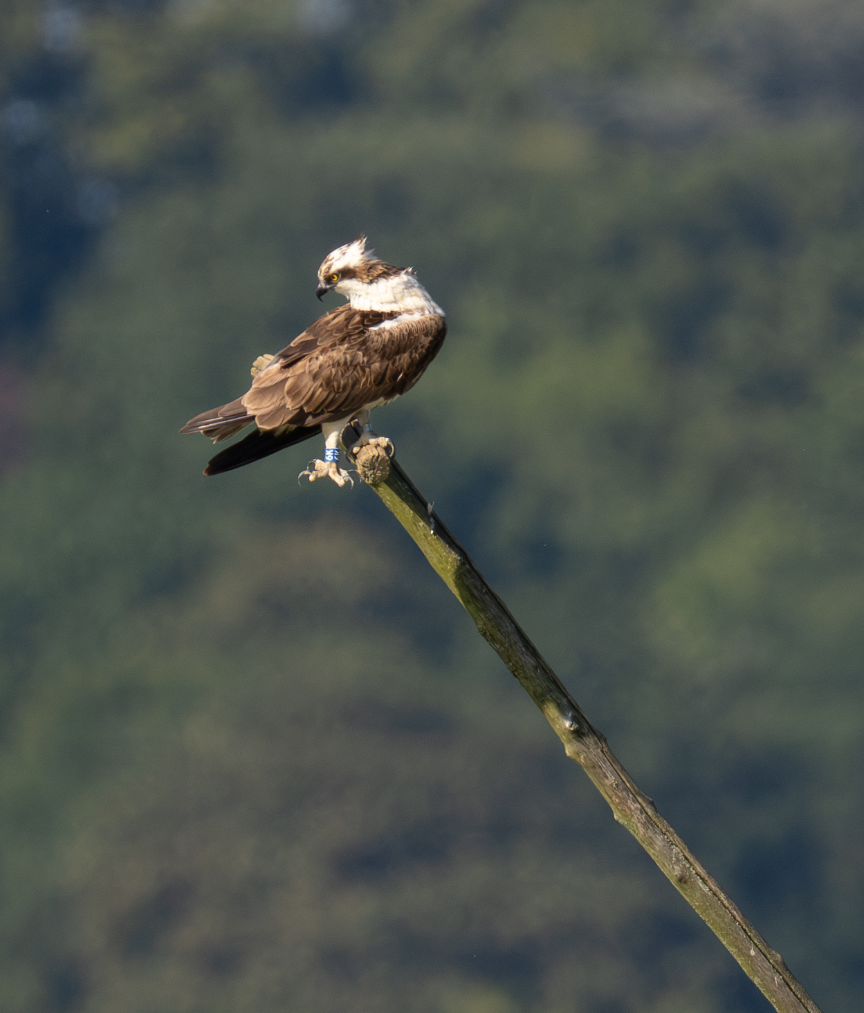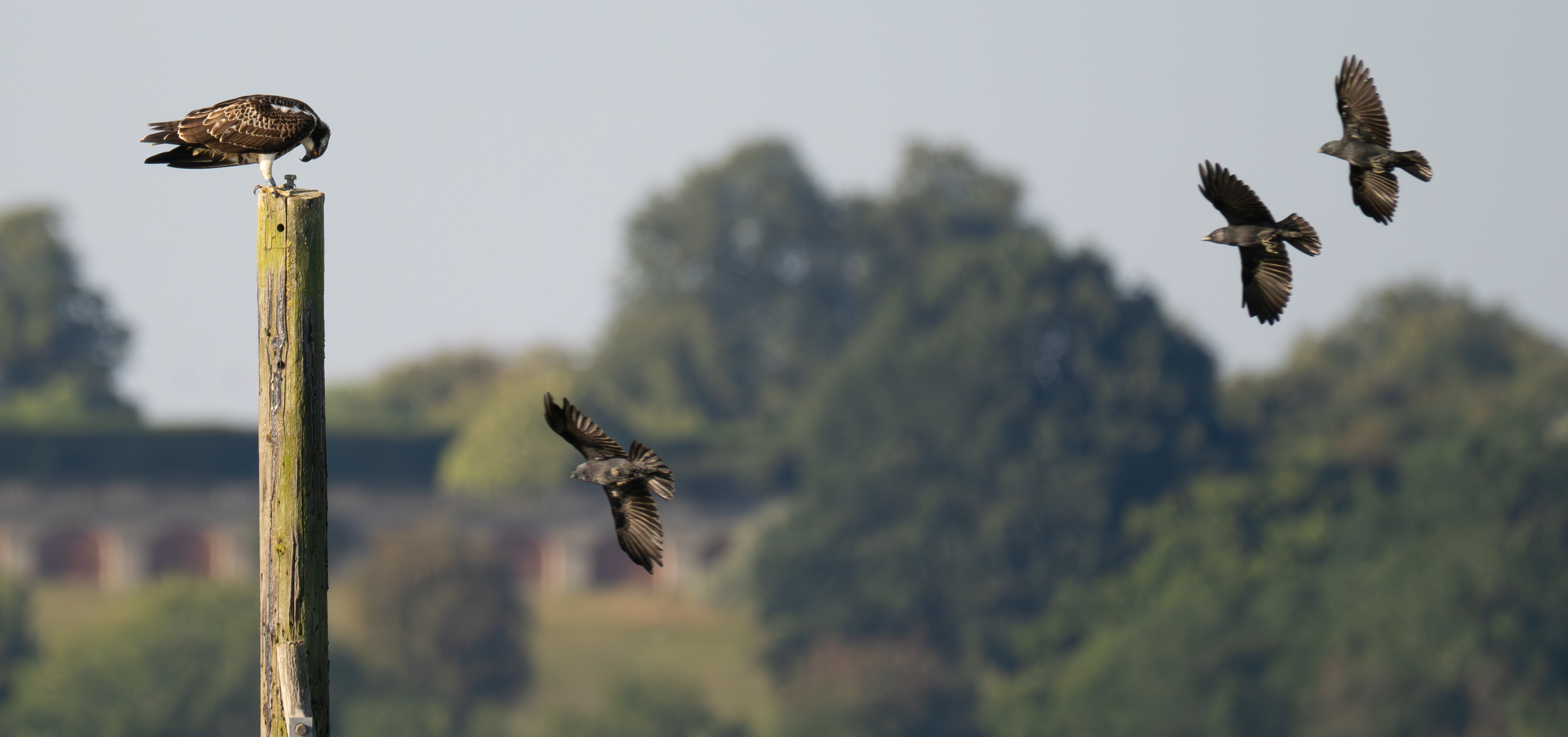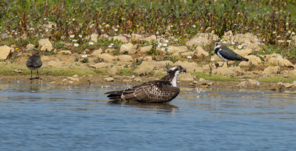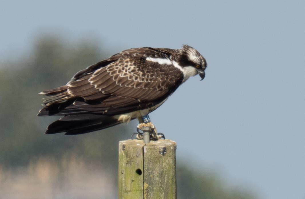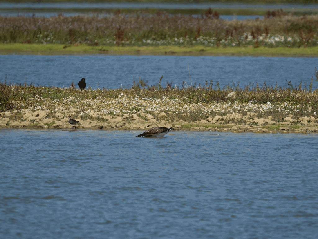 I visited the bird watching centre at Rutland Water this morning. Although the ospreys had already started their migration to West Africa the staff told me an osprey was visible on the platform in lagoon 4 visible from Dunlin Hide. I walked to the hide and immediately saw there were 2 ospreys visible – 1 on the platform (that apparently has never been used as a nest) and one on a pole to the left of the platform. After a while I was able to read the ring numbers – Blue 3H7 ( A 2023 juvenile from the Rutland translocation cohort and Adult 6K (Breeding male in the area but not the parent of 3H7).
