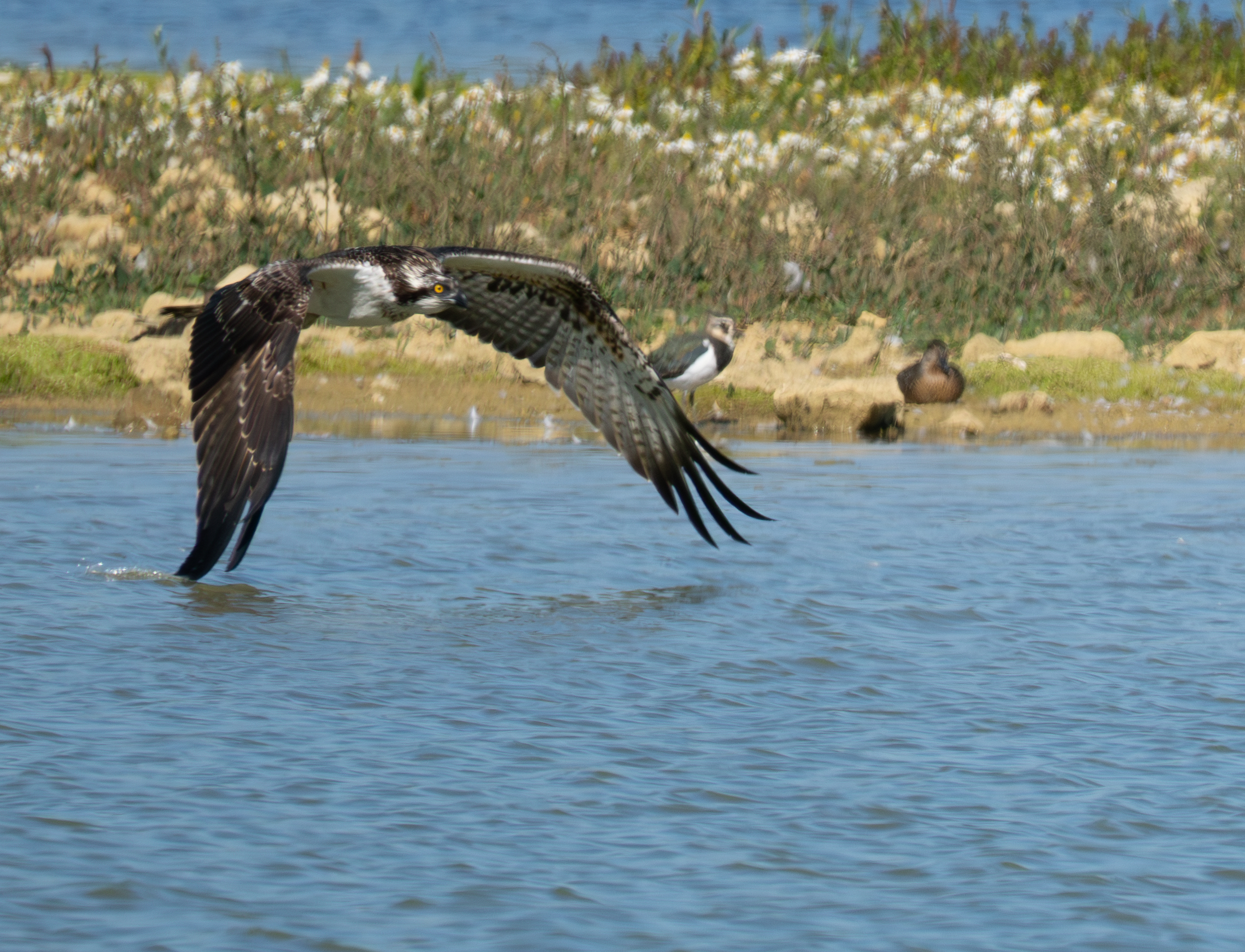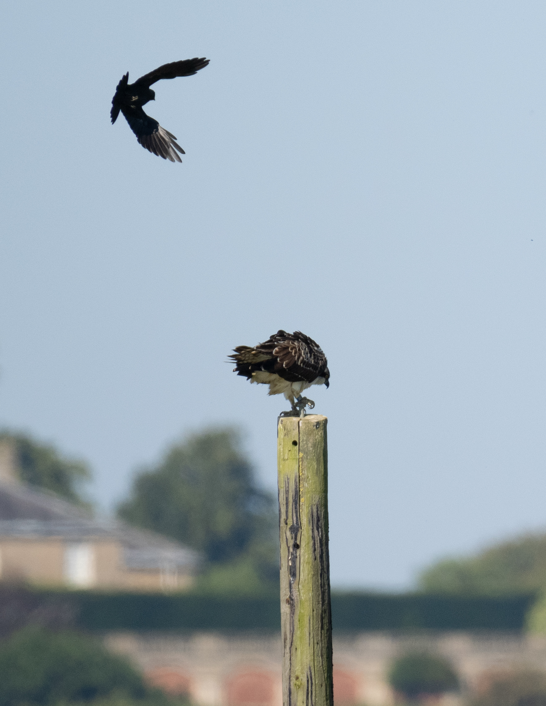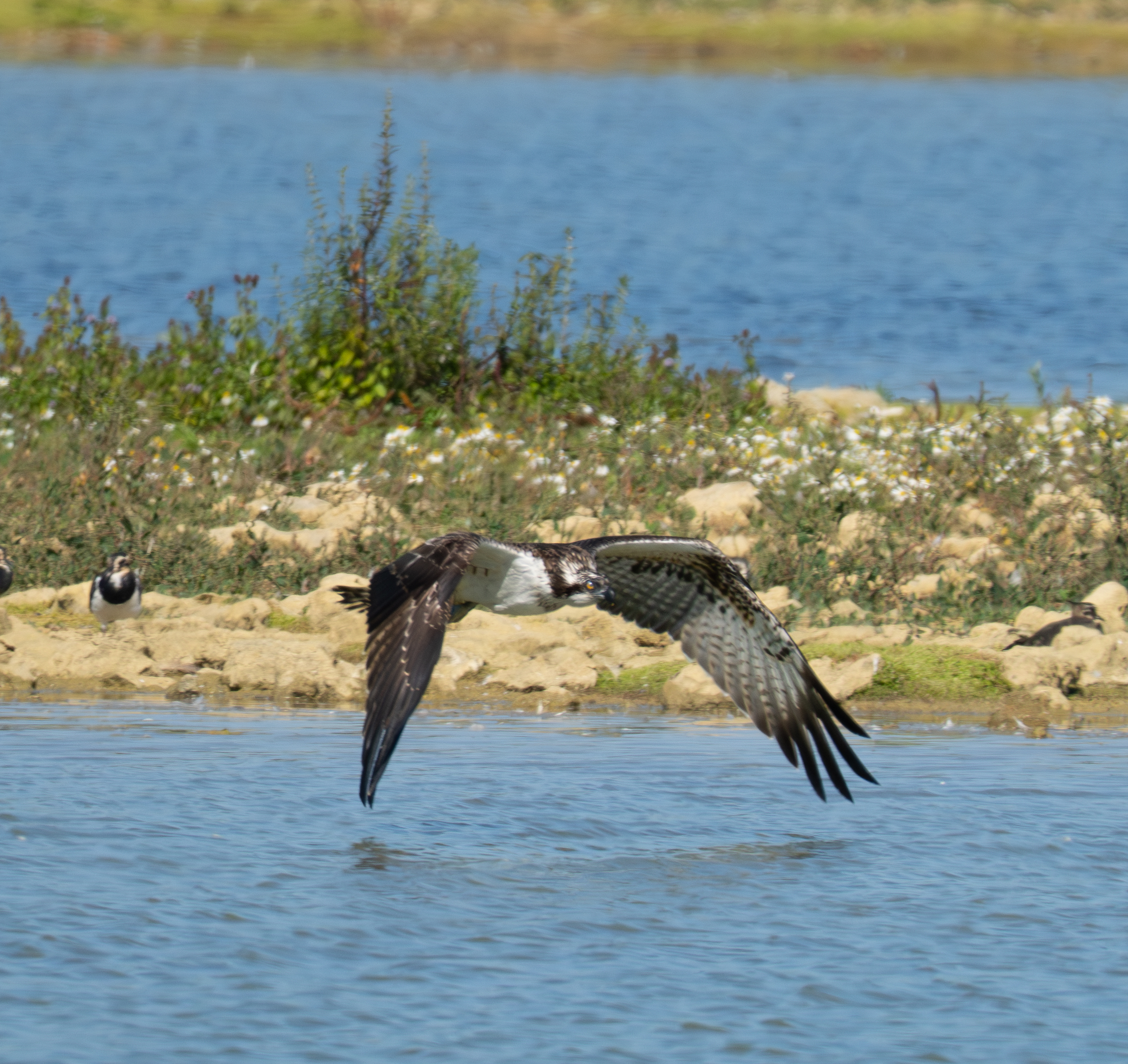 I visited the bird watching centre at Rutland Water this morning. Although the ospreys had already started their migration to West Africa the staff told me an osprey was visible on the platform in lagoon 4 visible from Dunlin Hide. I walked to the hide and immediately saw there were 2 ospreys visible – 1 on the platform (that apparently has never been used as a nest) and one on a pole to the left of the platform. After a while I was able to read the ring numbers – Blue 3H7 ( A 2023 juvenile from the Rutland translocation cohort and Adult 6K (Breeding male in the area but not the parent of 3H7).