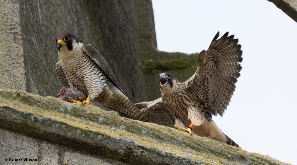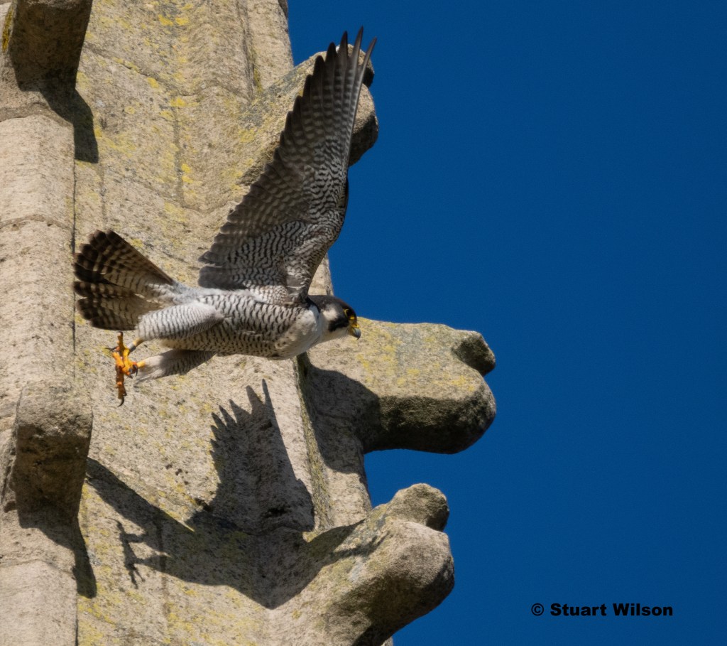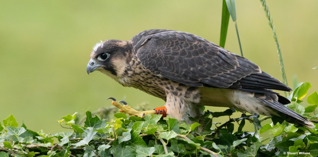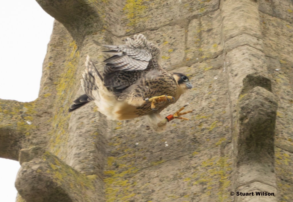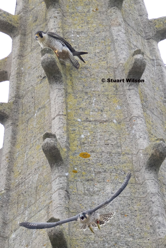 Early this year a male peregrine was spotted in and around the tower of St Peters’ Church in Yaxley Nr Peterborough. Several different females were seen vying for the males’ affection. It was soon spotted that the male was ringed – Orange VJP. This male was part of a brood reared in Stamford in 2021 so it was fantastic to see this male potentially pairing up and breeding.