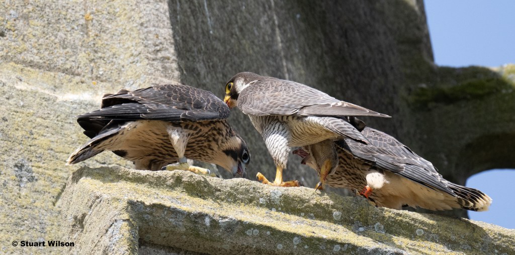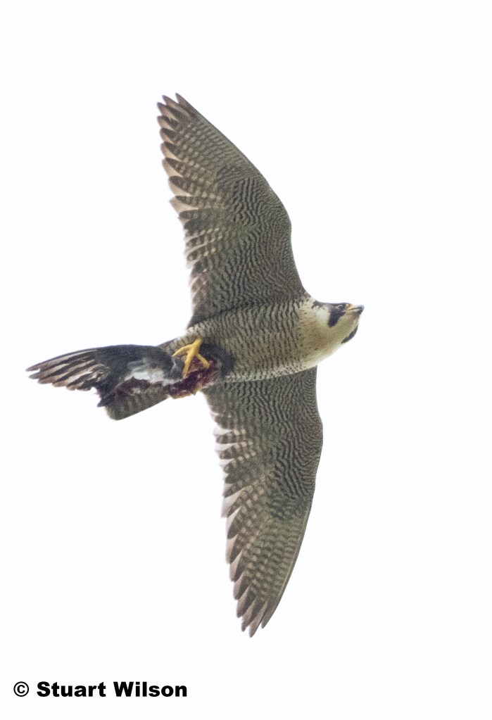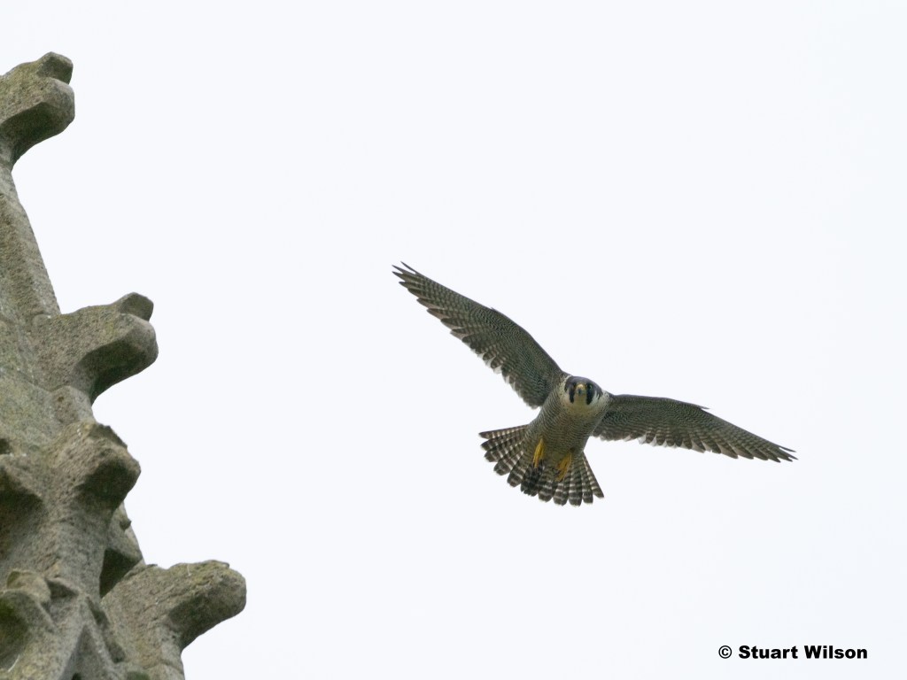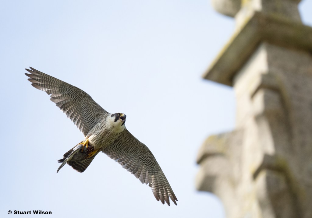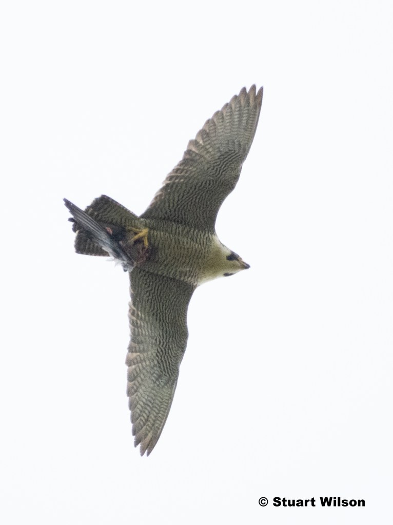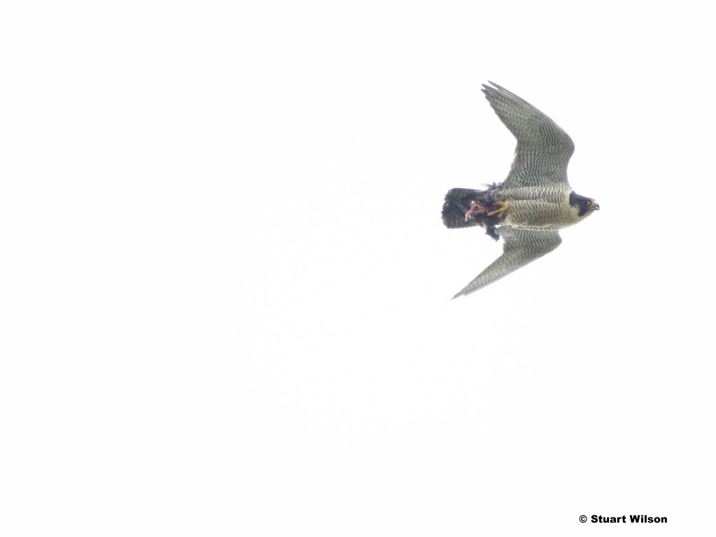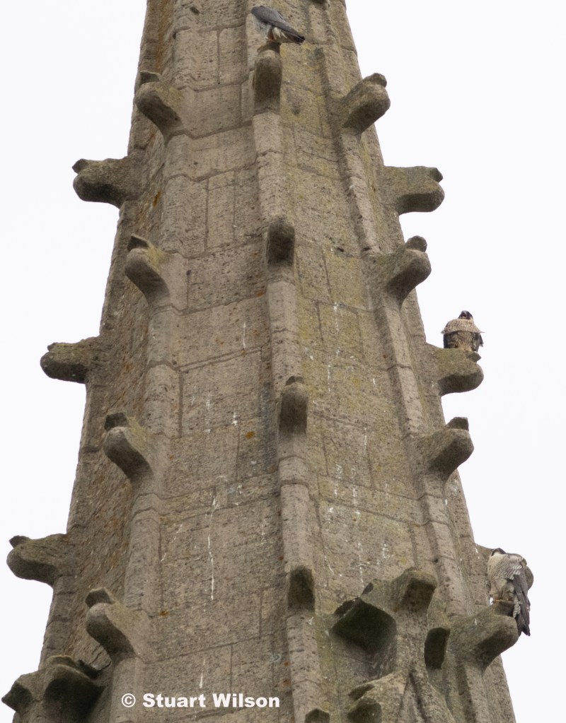 I took a visit to Yaxley in the morning. There had been some chatter that the male hadn’t been seen much but I saw him straight away and fairly soon he flew off presumably to hunt. I also spotted the female on the spire (she is an un-ringed bird). There wasn’t any action for several hours when the male returned with no food. He again flew off and after several hours had still not returned. I noticed around mid afternoon the female dropping off the tower just after a pigeon flew past. I didn’t think much of that but only a few minutes later she was back with a pigeon. Shew flew around for nearly ten minutes loudly calling finally alighting on the top of the main square tower wall where she plucked the kill. She then dropped down behind the wall.