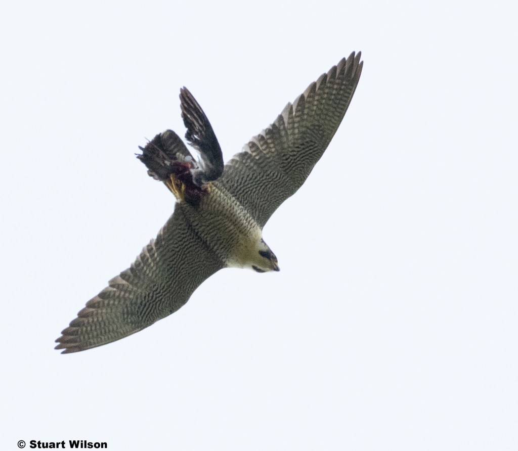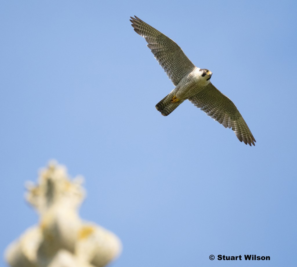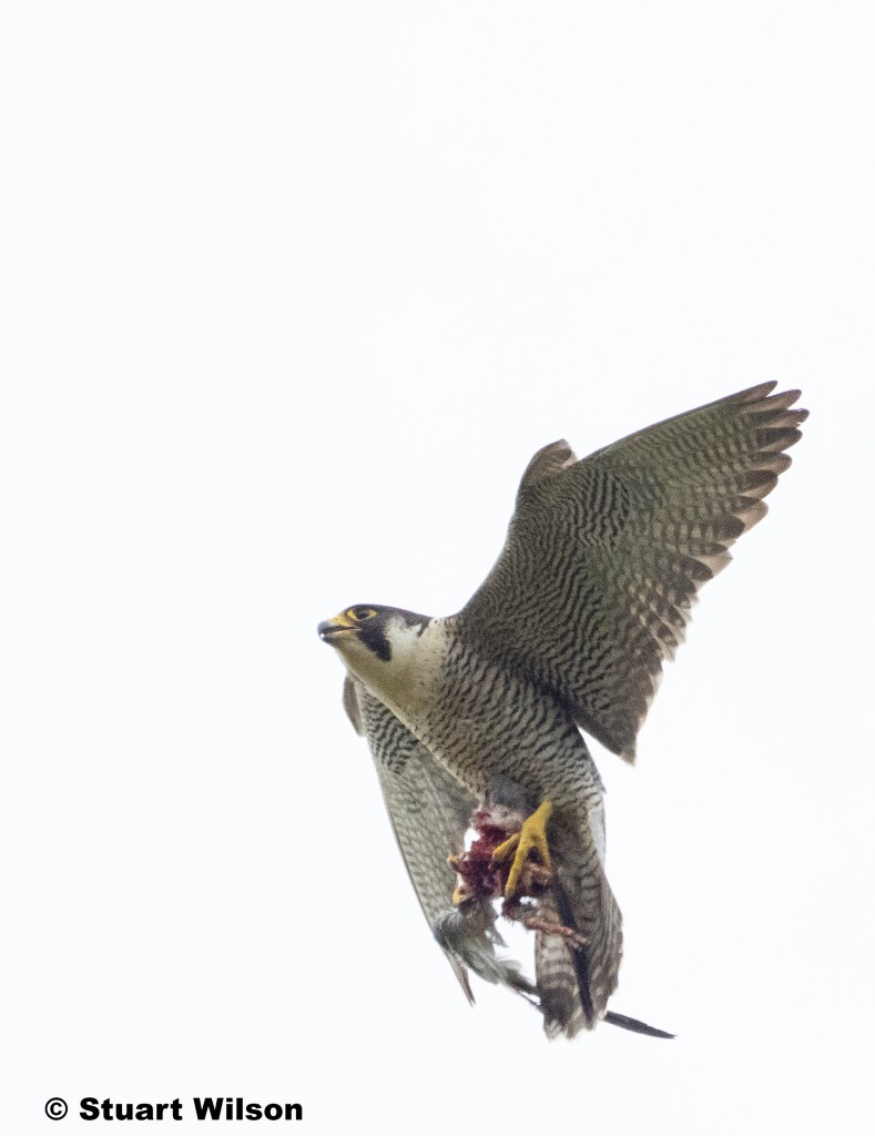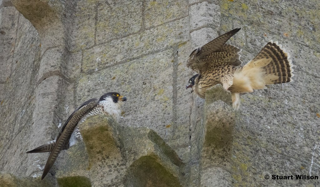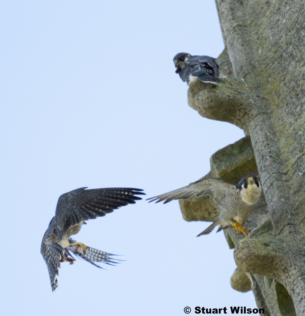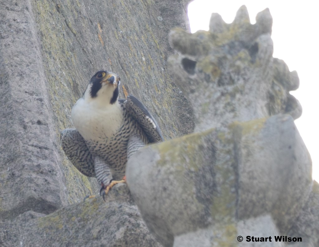 I took a visit to Yaxley in the morning. There had been some chatter that the male hadn’t been seen much but I saw him straight away and fairly soon he flew off presumably to hunt. I also spotted the female on the spire (she is an un-ringed bird). There wasn’t any action for several hours when the male returned with no food. He again flew off and after several hours had still not returned. I noticed around mid afternoon the female dropping off the tower just after a pigeon flew past. I didn’t think much of that but only a few minutes later she was back with a pigeon. Shew flew around for nearly ten minutes loudly calling finally alighting on the top of the main square tower wall where she plucked the kill. She then dropped down behind the wall.