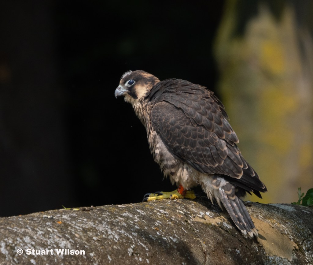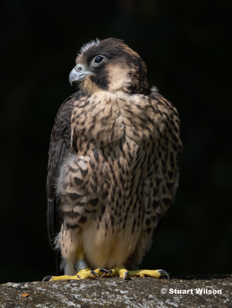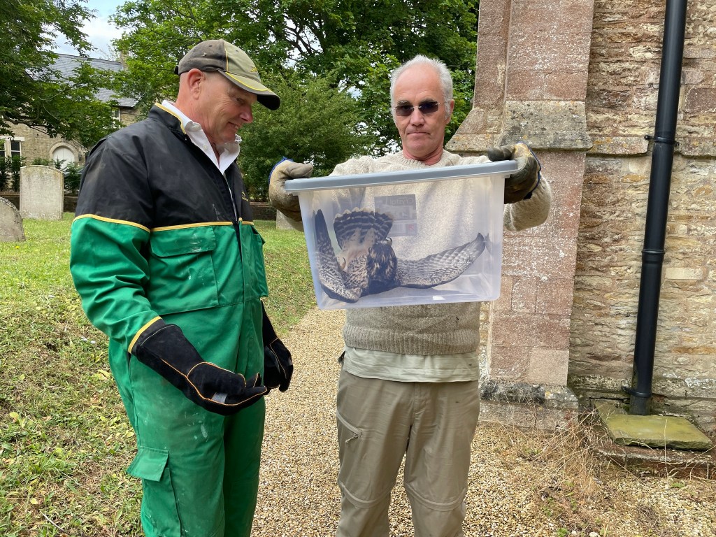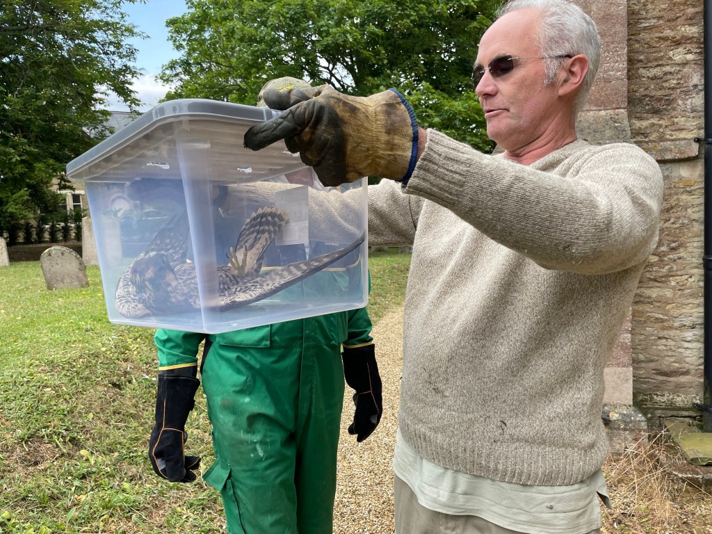 At about 11am I was met around the back of the church by a photographer whose husband had brought a van to a nearby garage for work and dropped her off at the church. She mentioned (I think her name was Janet Dobson) that she thought she’d seen one of the falcons in the large tree to the right of the graveyard as you enter the church grounds. I said no that won’t be a peregrine. We watched the falcons and one of the adults returned both food and flew to the front of the church. As we walked around Janet spotted a chick on the wall at the back of the church! Clearly she’d been correct and we soon saw it was VAH that had clearly made a mis-calculation! I went to the box and dialled the numbers on the information left. I decided I wasn’t going to try and catch this chick as I could see easily that it could run pretty fast and frankly I cannot.