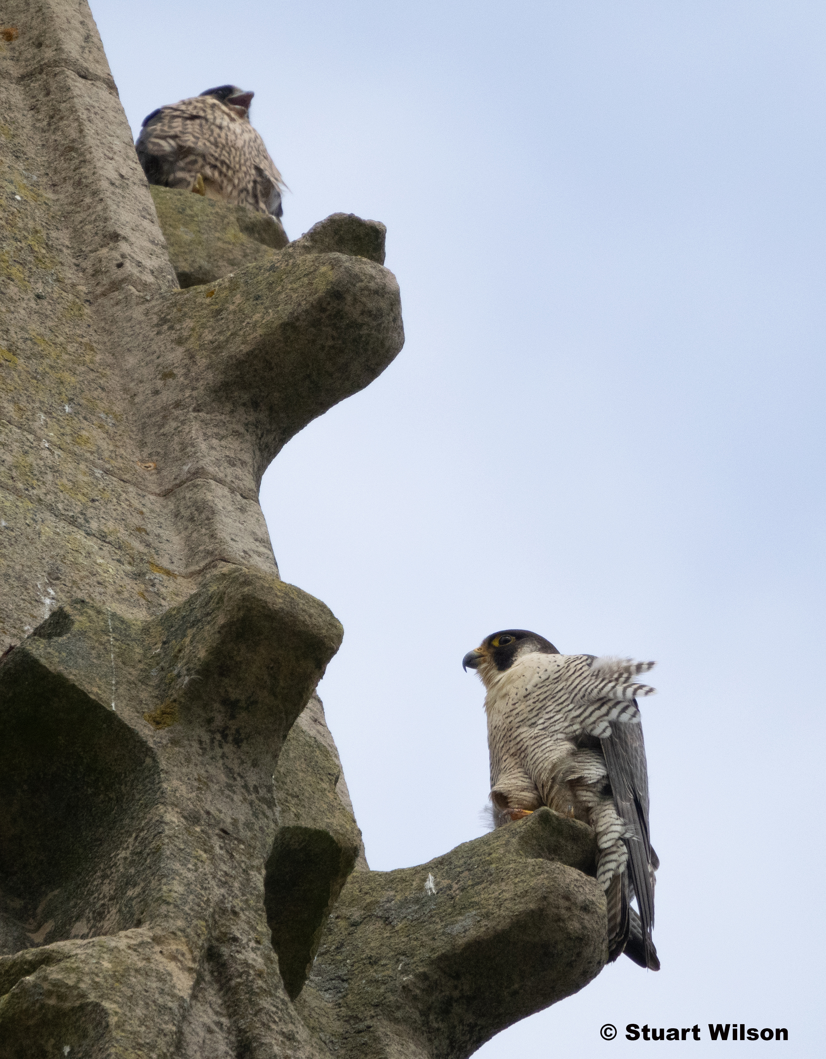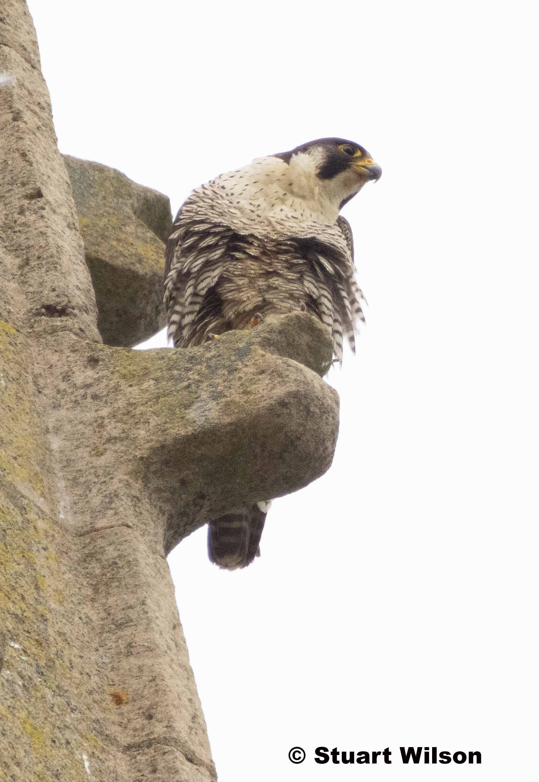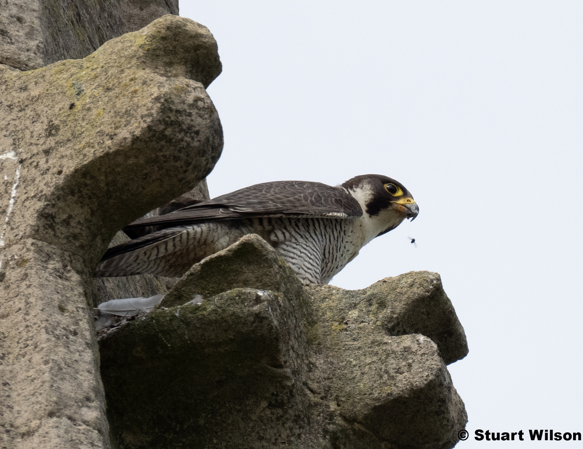 I took a visit to Yaxley in the morning. There had been some chatter that the male hadn’t been seen much but I saw him straight away and fairly soon he flew off presumably to hunt. I also spotted the female on the spire (she is an un-ringed bird). There wasn’t any action for several hours when the male returned with no food. He again flew off and after several hours had still not returned. I noticed around mid afternoon the female dropping off the tower just after a pigeon flew past. I didn’t think much of that but only a few minutes later she was back with a pigeon. Shew flew around for nearly ten minutes loudly calling finally alighting on the top of the main square tower wall where she plucked the kill. She then dropped down behind the wall.
