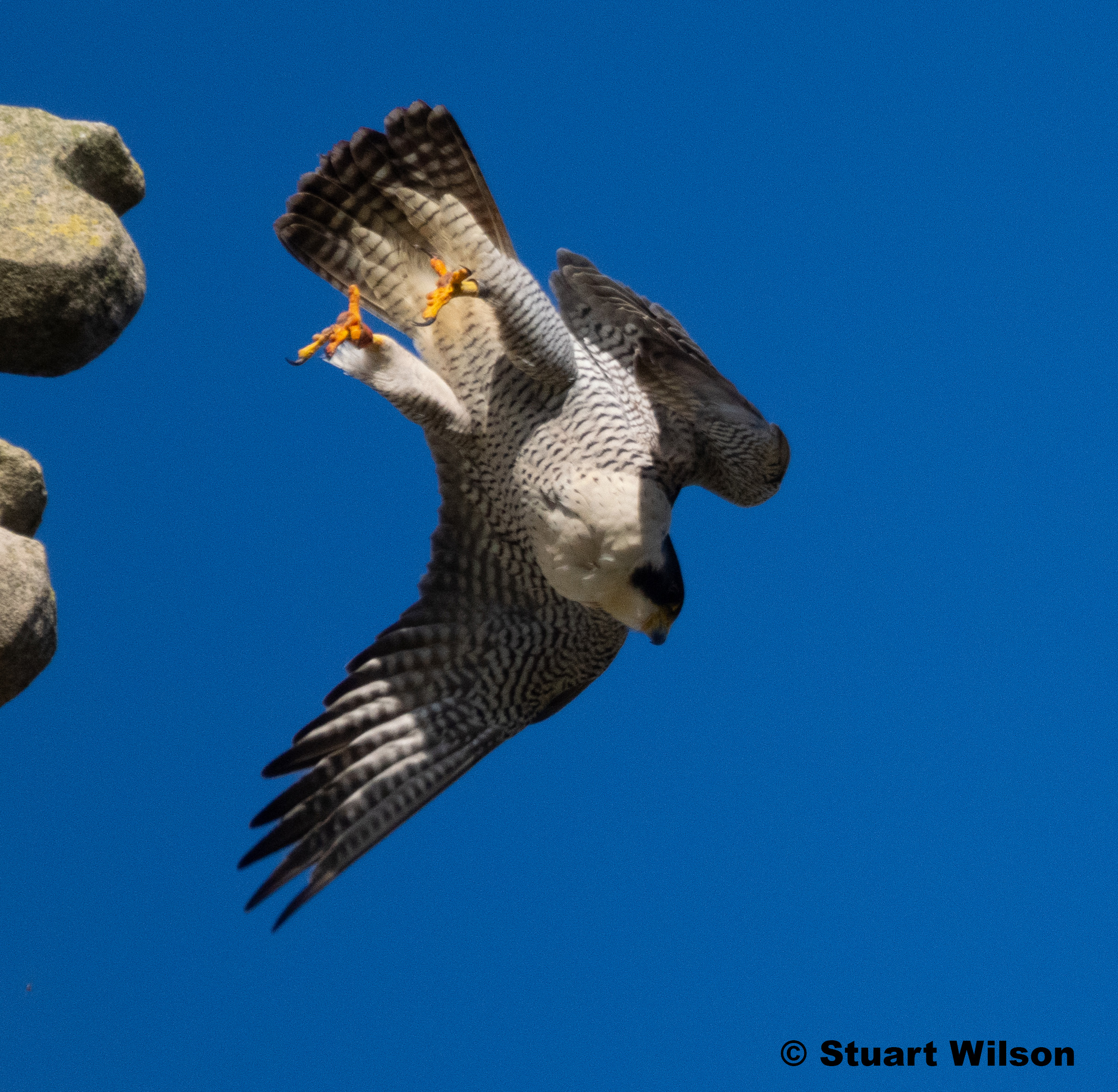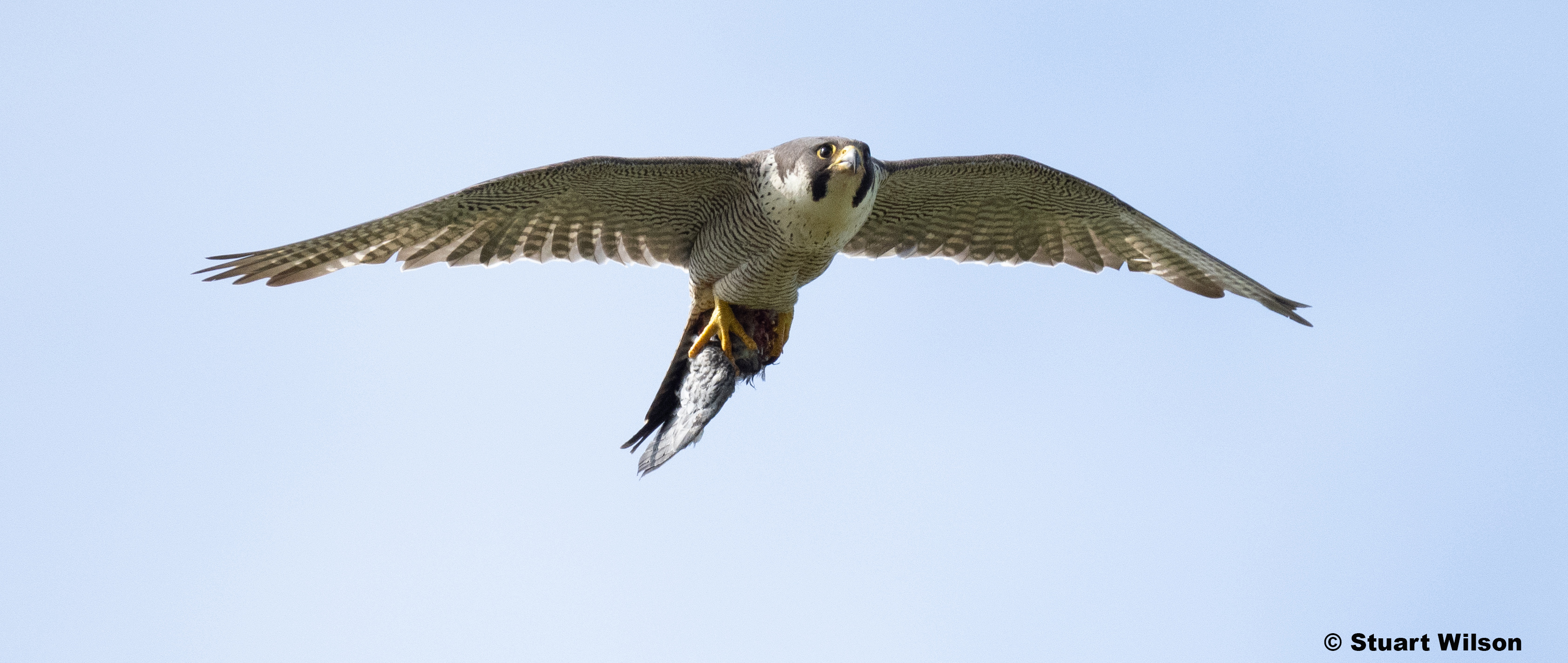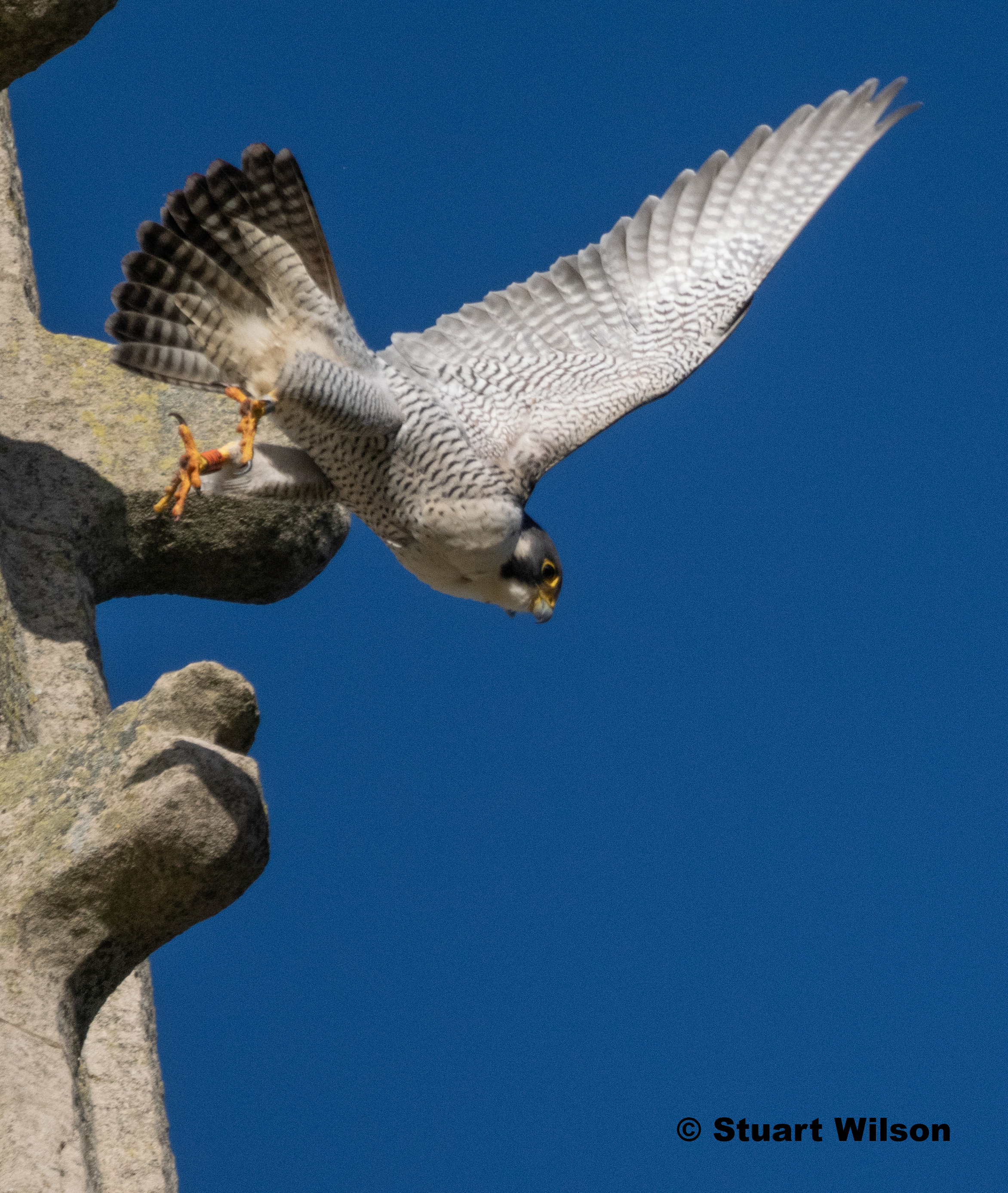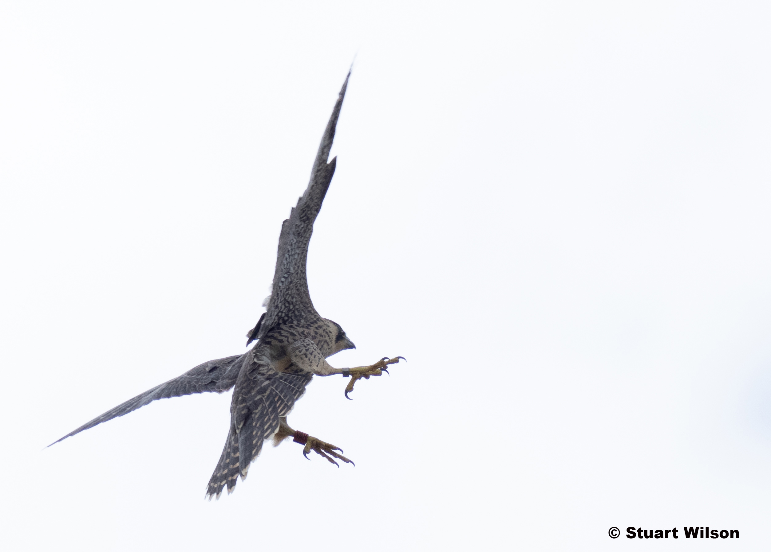 I took a visit to Yaxley in the morning. There had been some chatter that the male hadn’t been seen much but I saw him straight away and fairly soon he flew off presumably to hunt. I also spotted the female on the spire (she is an un-ringed bird). There wasn’t any action for several hours when the male returned with no food. He again flew off and after several hours had still not returned. I noticed around mid afternoon the female dropping off the tower just after a pigeon flew past. I didn’t think much of that but only a few minutes later she was back with a pigeon. Shew flew around for nearly ten minutes loudly calling finally alighting on the top of the main square tower wall where she plucked the kill. She then dropped down behind the wall.