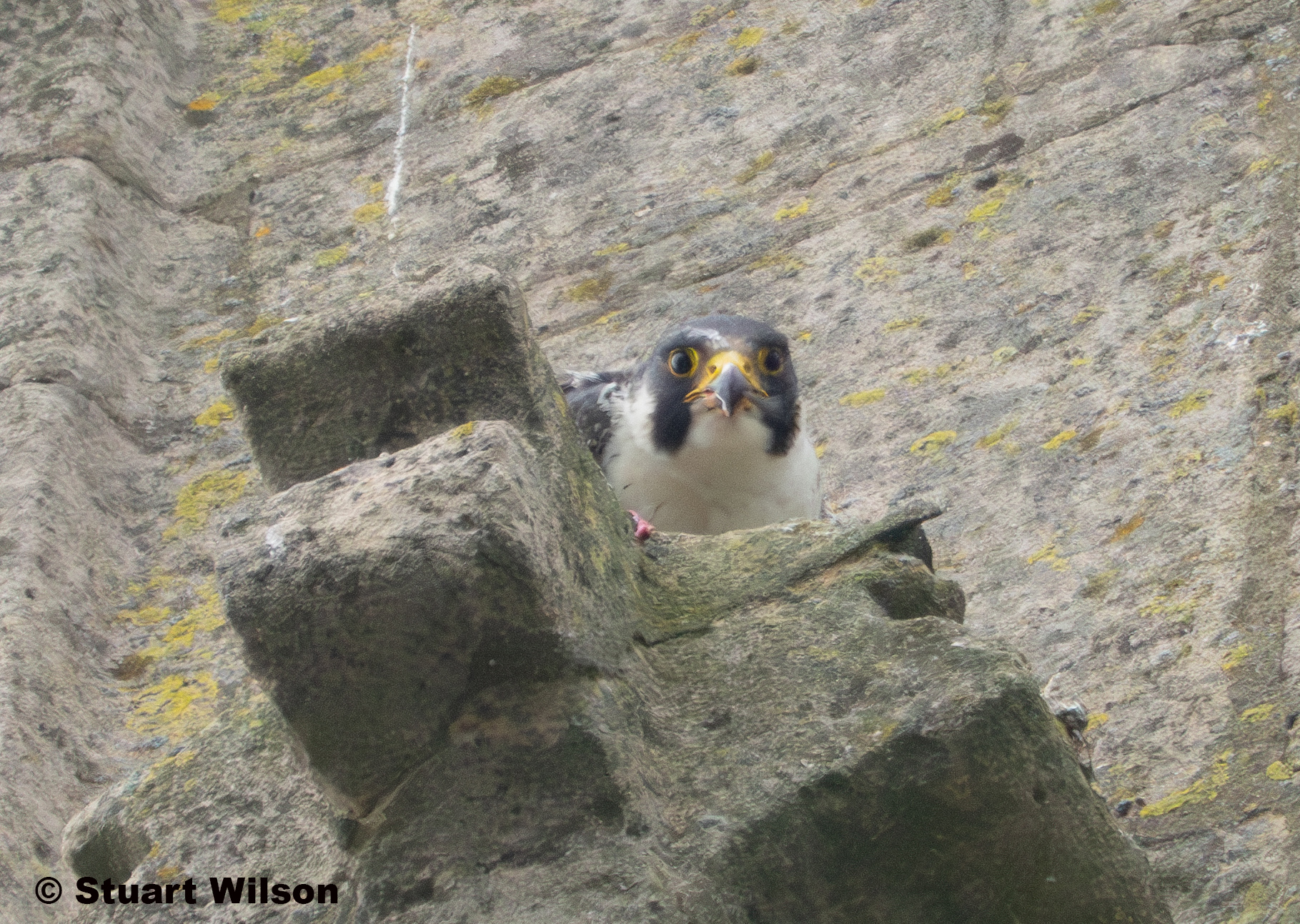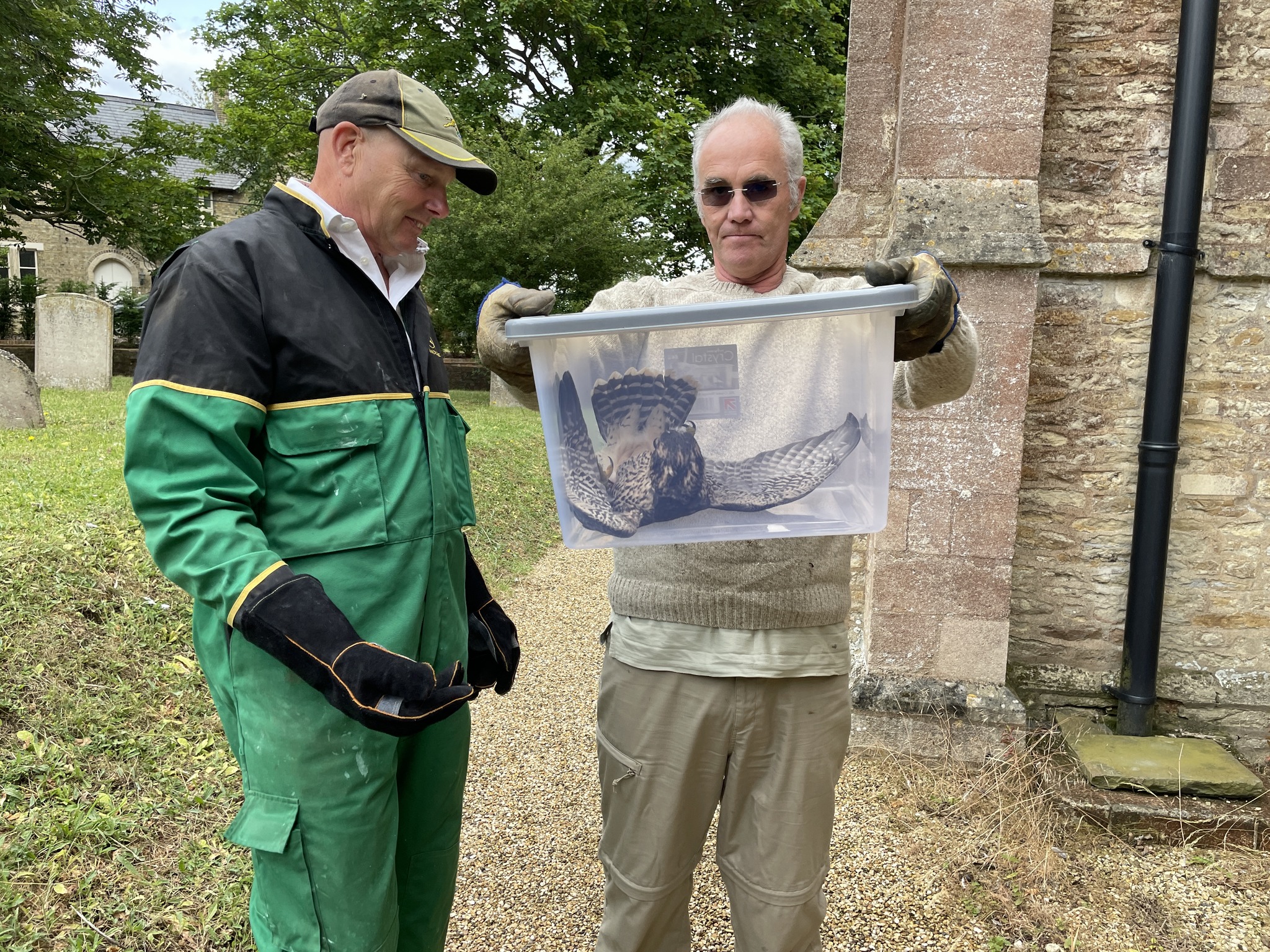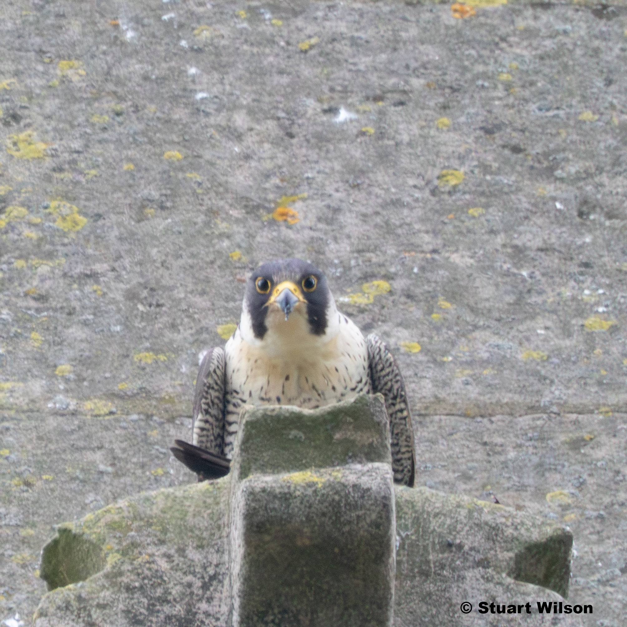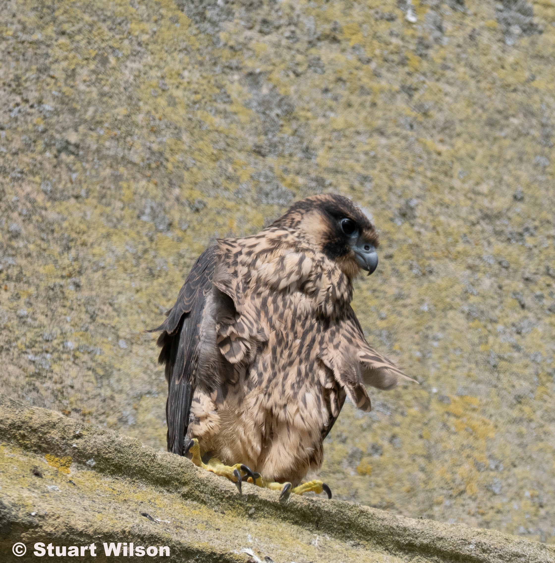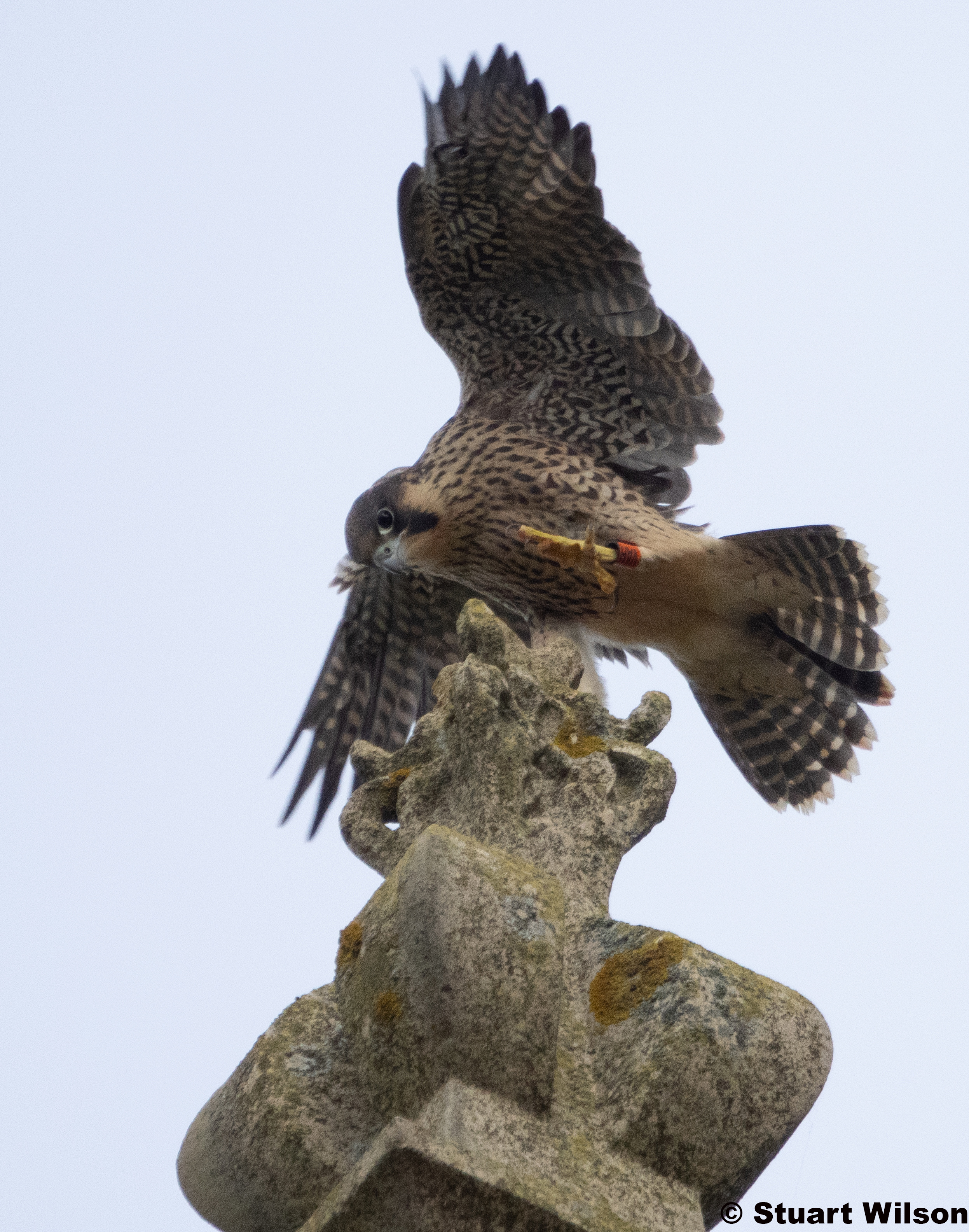 At about 11am I was met around the back of the church by a photographer whose husband had brought a van to a nearby garage for work and dropped her off at the church. She mentioned (I think her name was Janet Dobson) that she thought she’d seen one of the falcons in the large tree to the right of the graveyard as you enter the church grounds. I said no that won’t be a peregrine. We watched the falcons and one of the adults returned both food and flew to the front of the church. As we walked around Janet spotted a chick on the wall at the back of the church! Clearly she’d been correct and we soon saw it was VAH that had clearly made a mis-calculation! I went to the box and dialled the numbers on the information left. I decided I wasn’t going to try and catch this chick as I could see easily that it could run pretty fast and frankly I cannot.