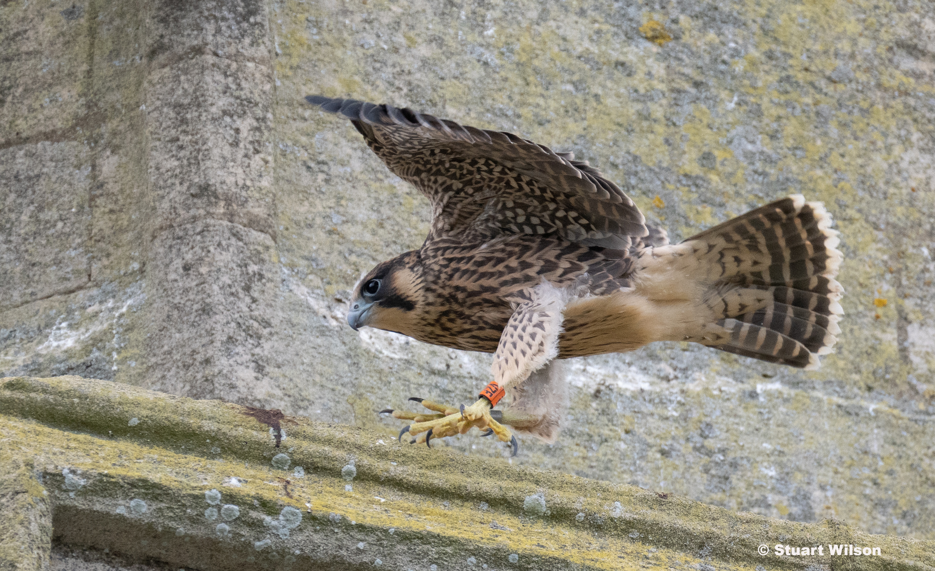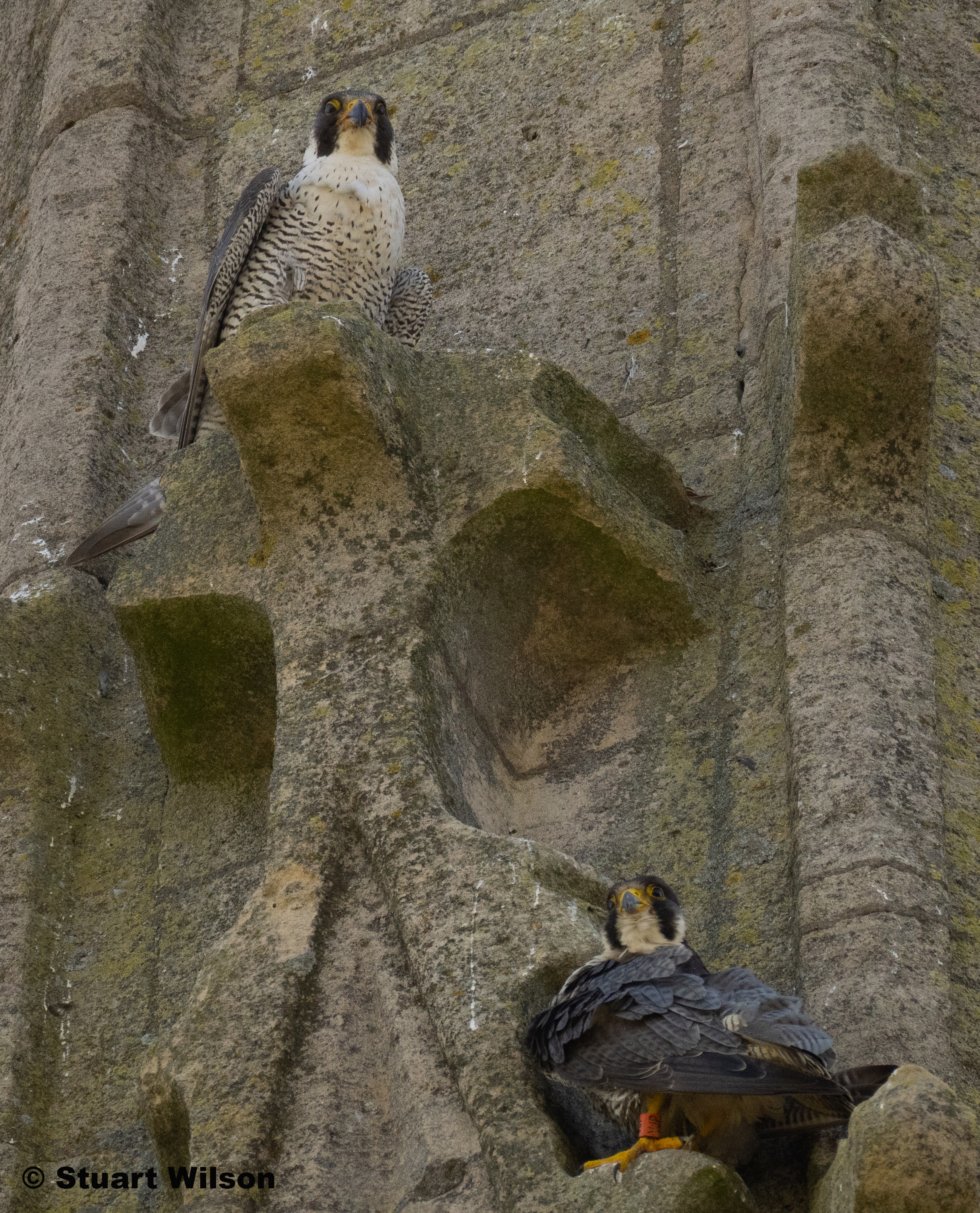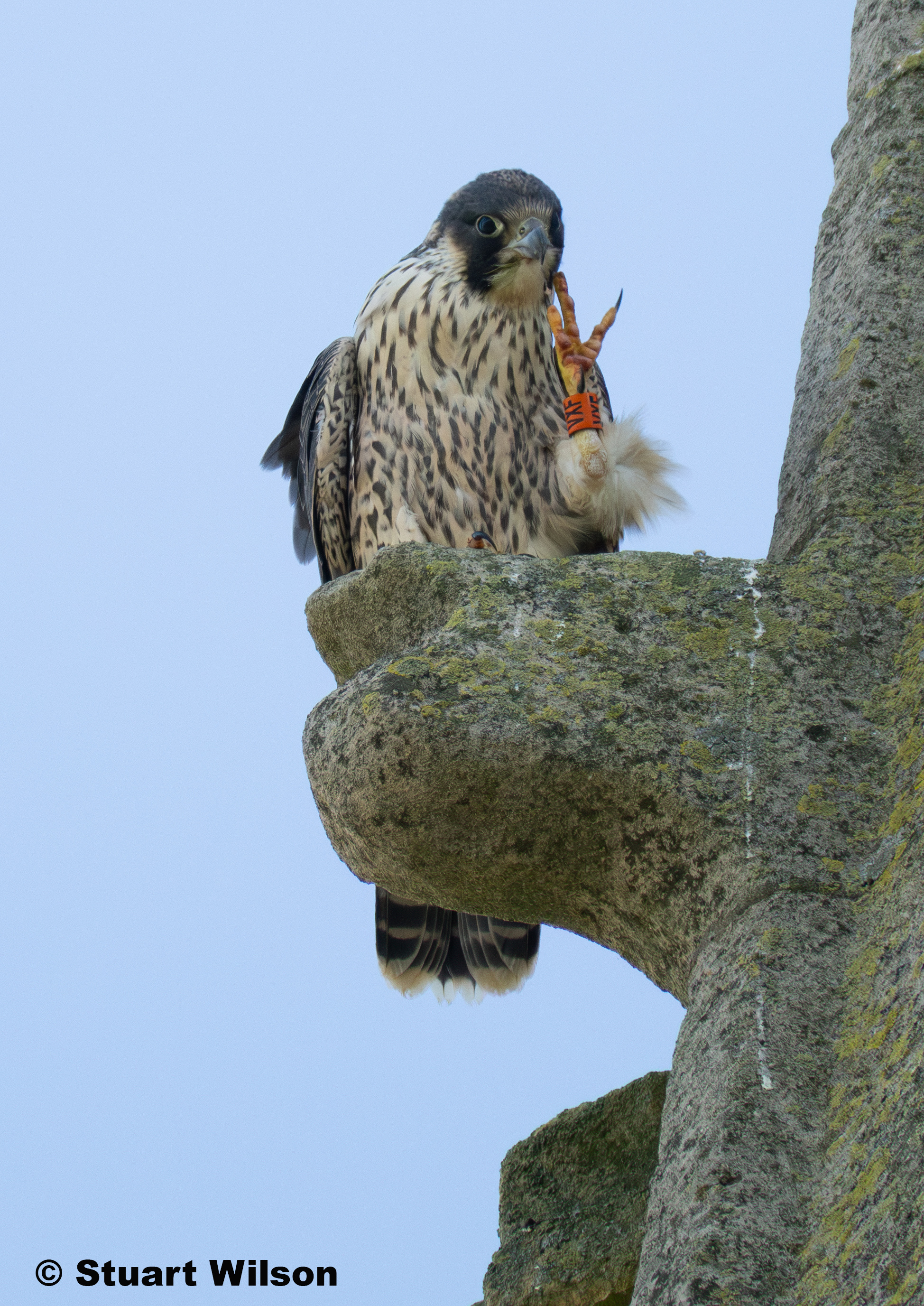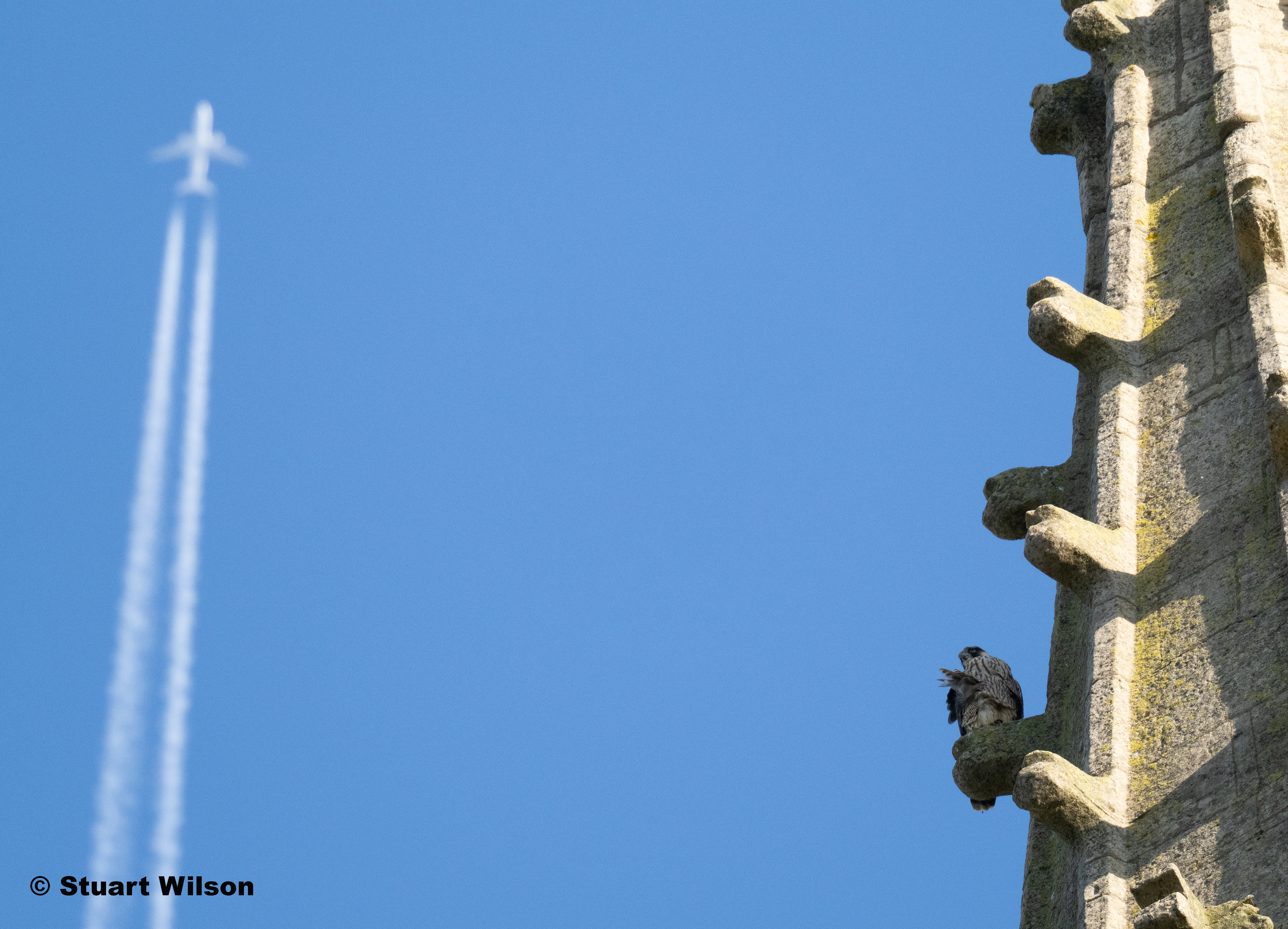 Early this year a male peregrine was spotted in and around the tower of St Peters’ Church in Yaxley Nr Peterborough. Several different females were seen vying for the males’ affection. It was soon spotted that the male was ringed – Orange VJP. This male was part of a brood reared in Stamford in 2021 so it was fantastic to see this male potentially pairing up and breeding.