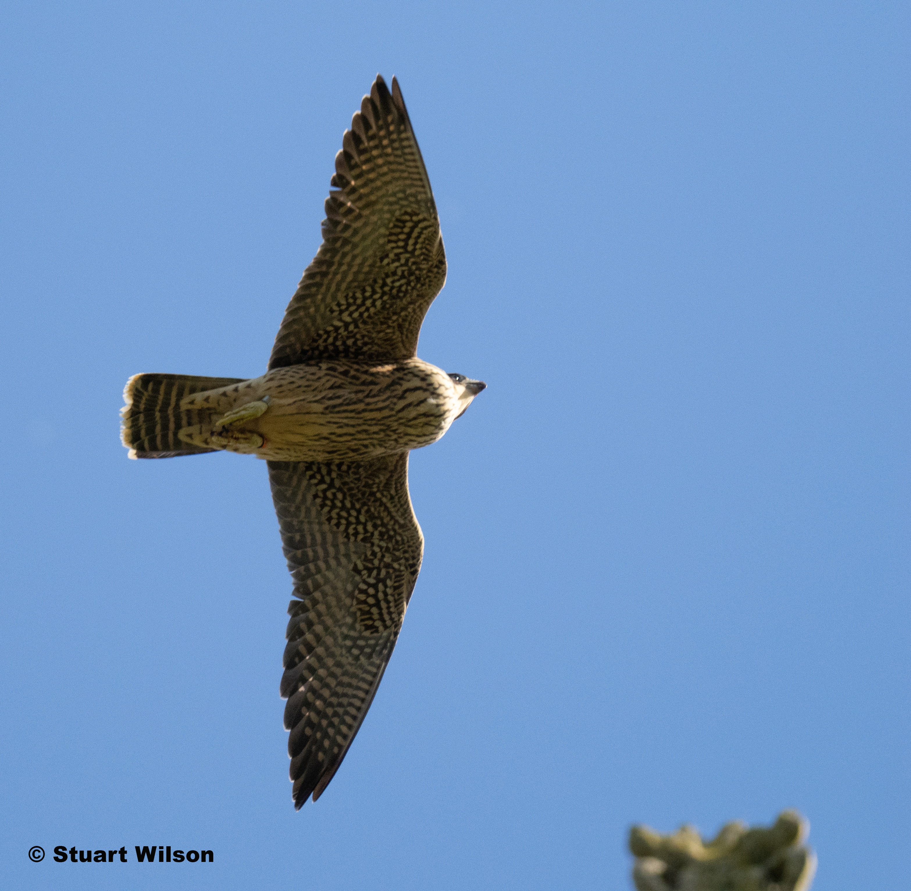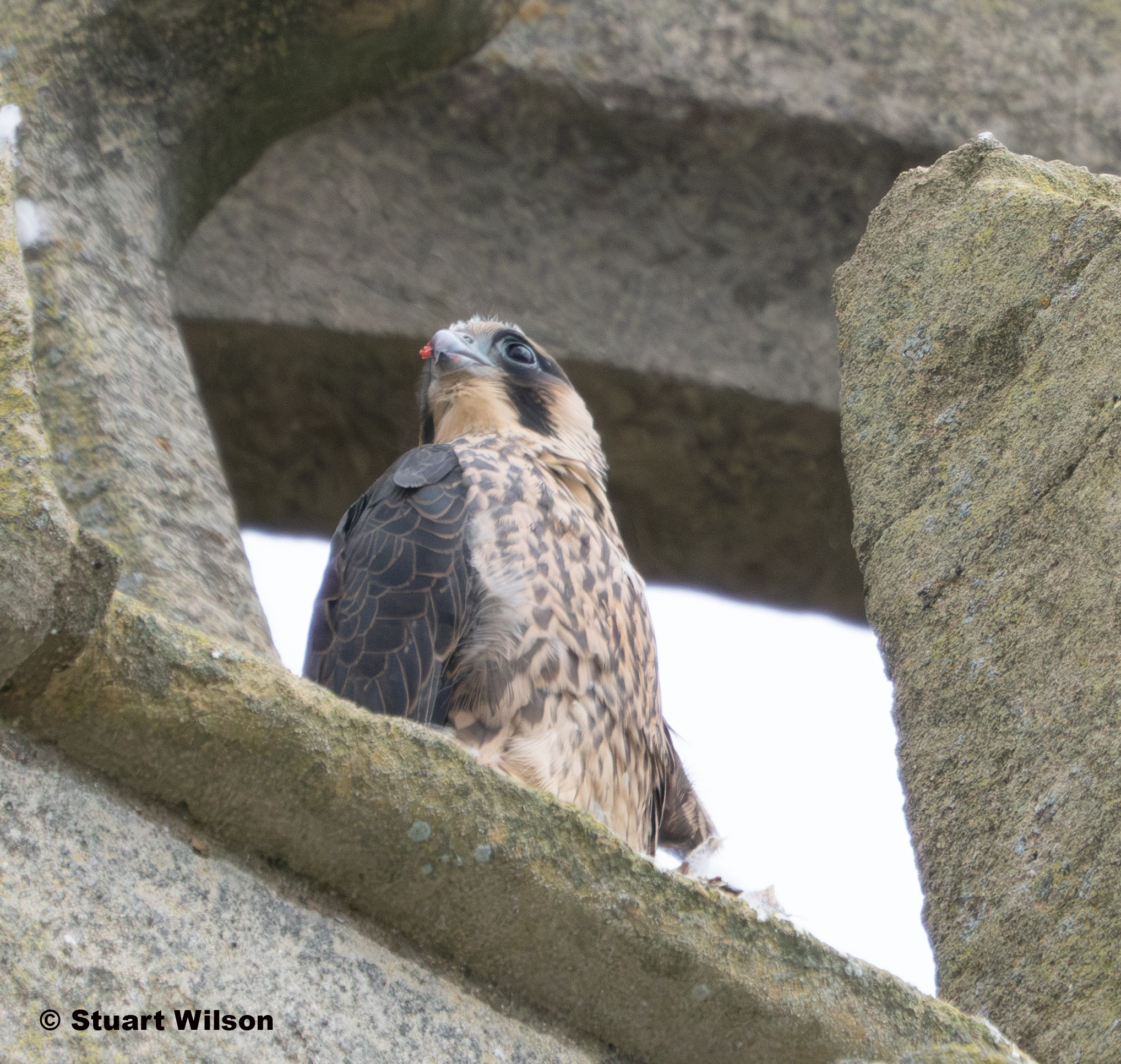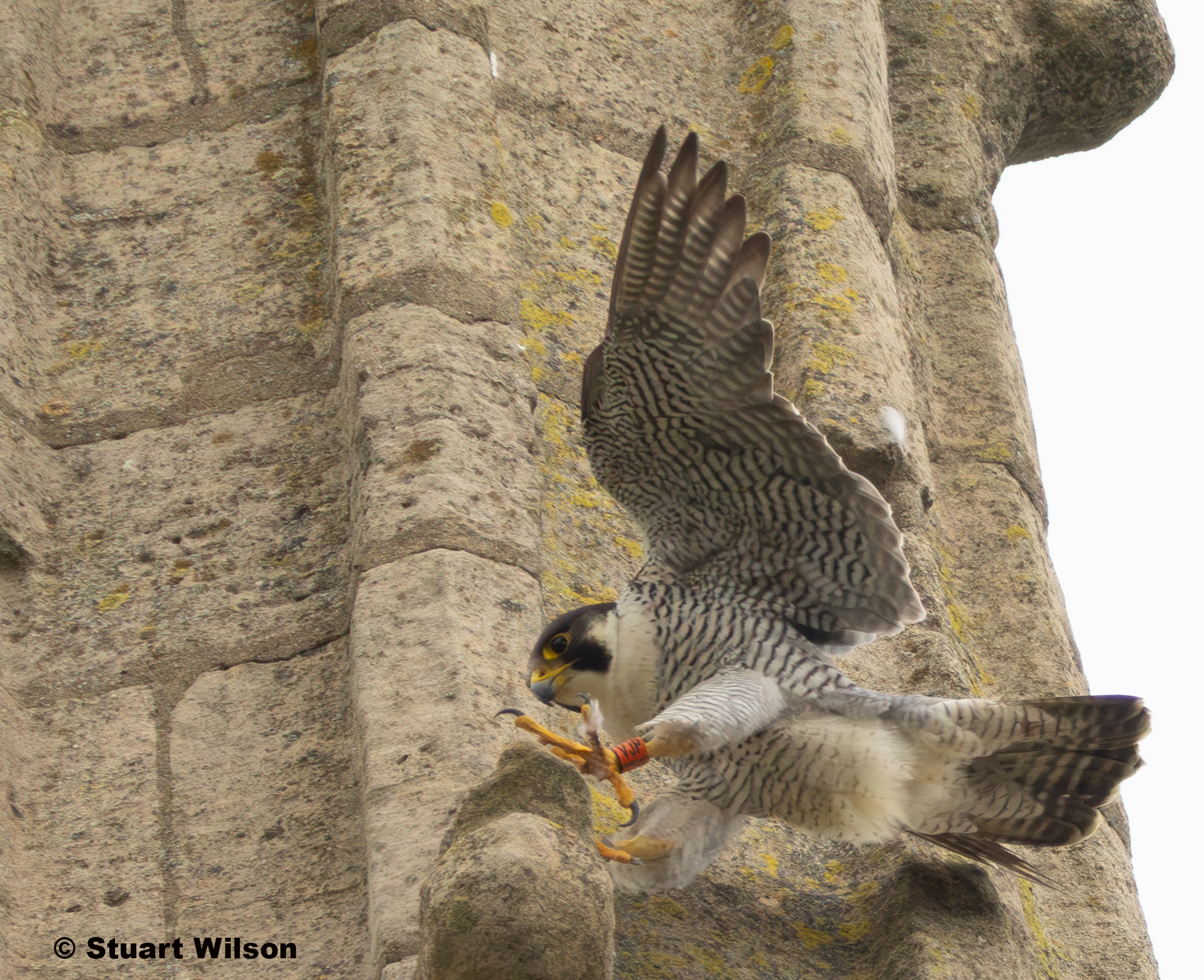 Early this year a male peregrine was spotted in and around the tower of St Peters’ Church in Yaxley Nr Peterborough. Several different females were seen vying for the males’ affection. It was soon spotted that the male was ringed – Orange VJP. This male was part of a brood reared in Stamford in 2021 so it was fantastic to see this male potentially pairing up and breeding.