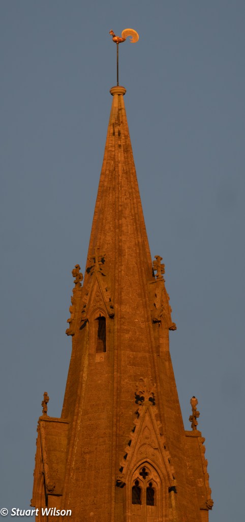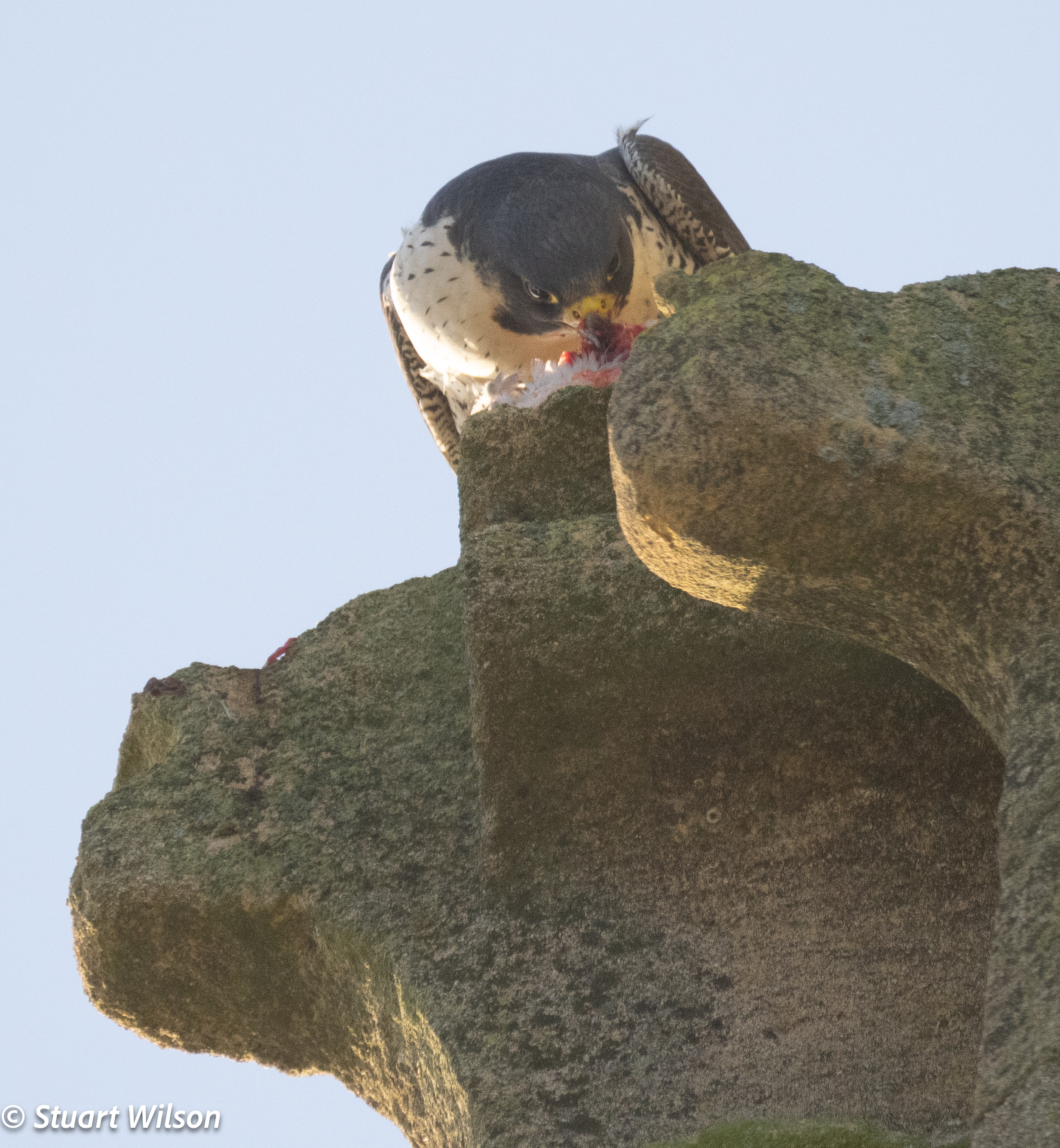 Dropped into Stamford just after sunrise. No sign of either peregrine until I noticed the tell-tale sign of feathers – the tiercel was busy eating prey on one of the gargoyles. In this video I like how we don’t see him directly rather we see his shadow on the church.