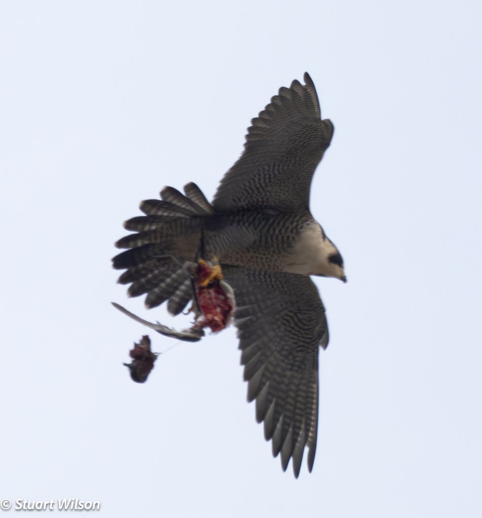 Yaxley’s finest falcon was at St Peter’s church this morning. She flew off and 10 minutes later returned with a pigeon. She called for the tiercel but he didn’t turn up so she ate the prey.