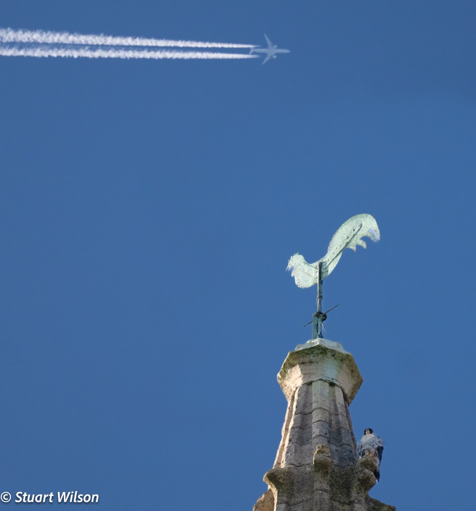Yaxley’s tiercel again looking fantastic. I love this shot (composite to get plane and bird in focus) of the peregrine, cockerel weather vane and jet plane.